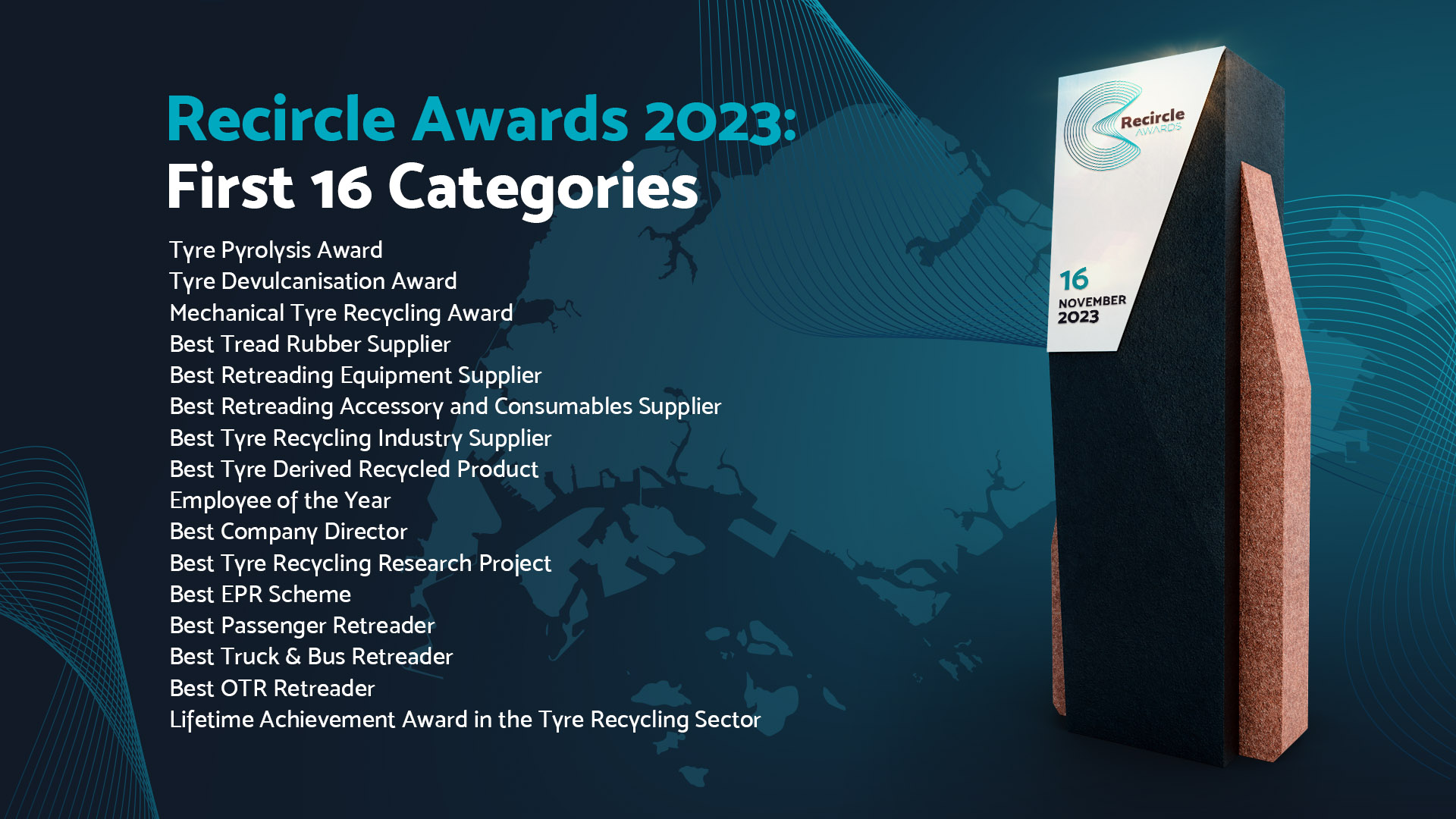 The Recircle Awards 2023 will incorporate a total of 22 awards covering a wide and balanced range of categories from across the tyre industry. 16 of these categories were already announced at the Official Launch of the 2023 Recircle Awards held on Wednesday, March 8 during the TyreXpo Asia show held at at the Marina Bay Sands Convention Centre in Singapore.